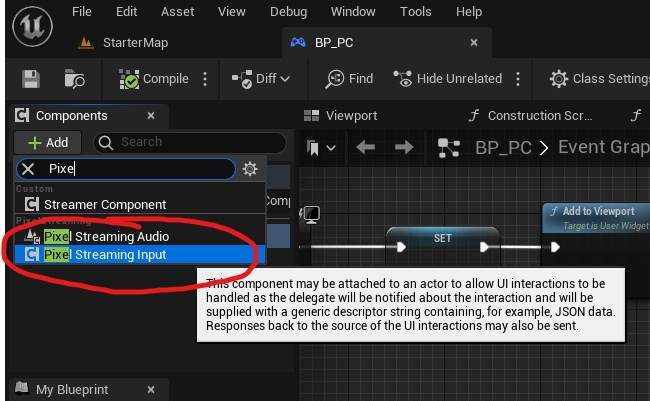 Drag and Drop the Pixel Streaming Input Component to the event graph and put it in the target. This method only works while you are in the player controller.