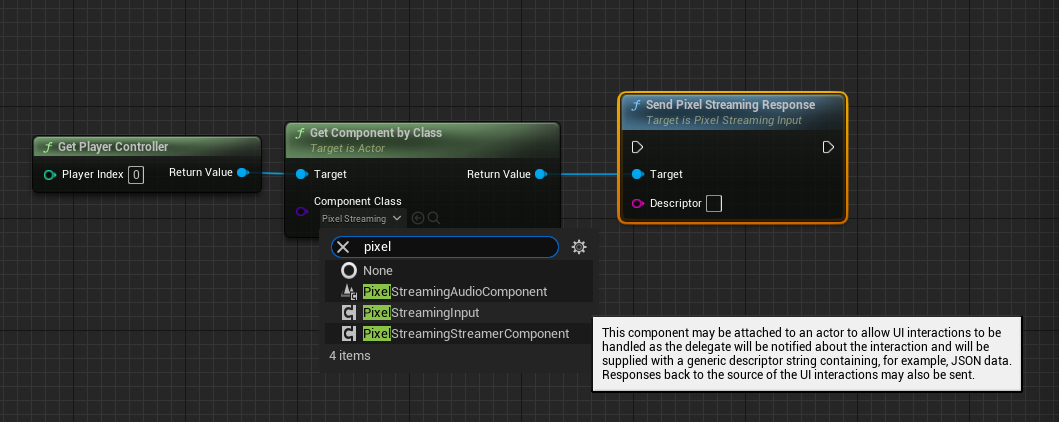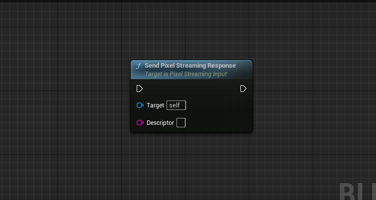 It would look like this. The target is going to be the Pixel Streaming component that you added in your player controller. The Descriptor is going to be the response that you want to send to the Pixel Streaming system.