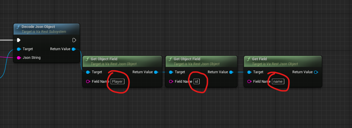 All you need to do is add one more node called “Get Field” and that will contain the Key name of the child object. Where the first “Get object Field” will contain the name of the main object which is “Player”. Here is an example of how to get the value “john” by Varest.